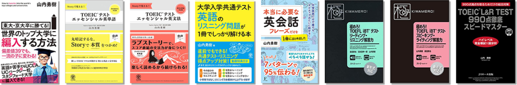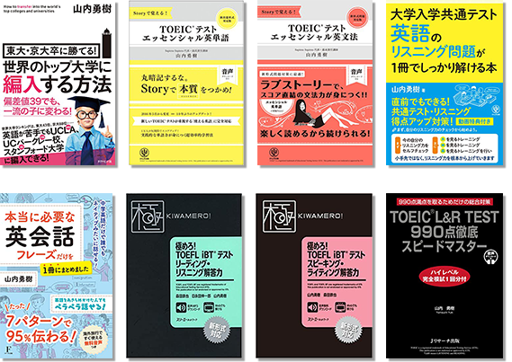 一番最初に出たのが、TOEIC の本が 2 つです。1 つは TOEIC の単語の本、あと文法の本が かんき出版から出ました。一応、私は TOEIC のテストも満点を保有させていただいているので、それと知り合いのつながりもあって、出版しましょうかという話になってしたのが 2 つ目です。ここでも コンセプトは楽しく、ストーリーを楽しみながら単語力とか文法理解を深めていきましょうというコンセプトの本です。それに続いて留学の本です。名門大学に留学したければこういう方法があるよ、 という私自身が通ってきた道をそのまま書籍にしたものです。世界の名門大学に合格しようと思えばできるよという主旨の本が 1 つあります。これはダイヤモンド出版社から出ているものです。続いて TOEFL の本です。TOEFL というのは留学を目指す生徒ですとか、進学の際に用いられるテストです。特に留学生が受けるテストとして受験者が多いです。その参考書が 1 冊出ています。 これはスリーエーネットワークという出版社が出している本です。あとは英会話、英会話を楽しく身 につけましょう、シンプルなフレーズを使ってどんどん言える表現を増やしていきましょう、という英会話の本が出ています。もう 1 個、大学受験生向けの、要するに高校生向けの本です。共通テストというものがありまして、昔で言うセンター試験です。センター試験はなくなって、今は共通テストという名前に変わっていますが、その共通テストの英語の対策本です。特に英語リスニング、リスニング対策本をかんき出版から出版させていただいています。もうすぐ TOEFL の 2 冊目が出ます。
